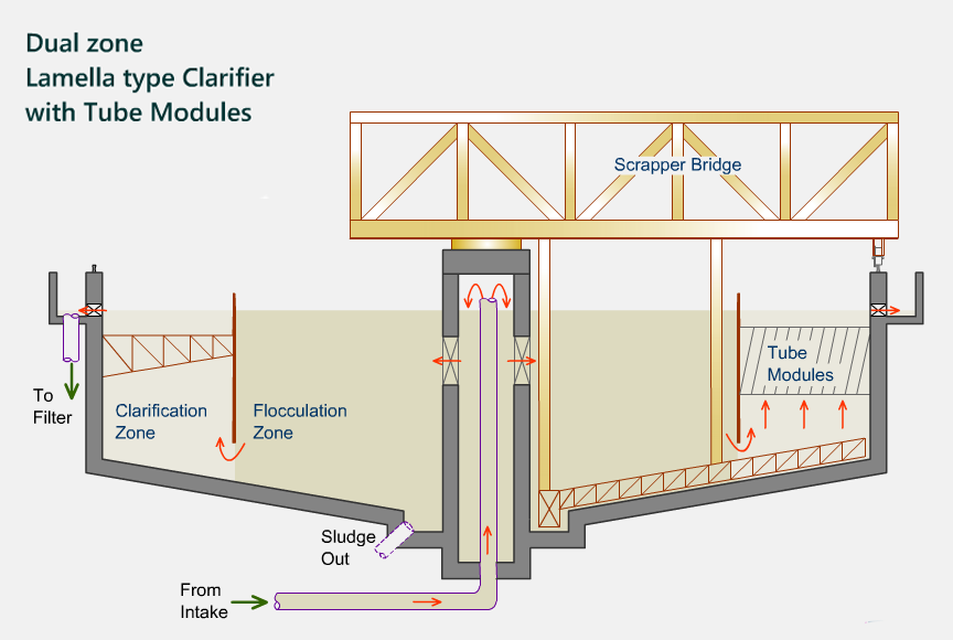 Clarifiers could be Conventional or Lamella type. Lamella type clarifiers are equipped with Modular Tube Settlers in the clarification zone. An electrically operated Scrapper Bridge is standard for these both type of clarifiers. Separate Sludge Ejection mechanism remains attached at the bottom of clarifiers.